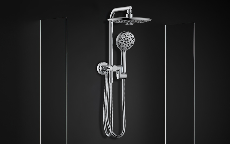 8. Wide top spray; Z-shaped tee; Press to switch top spray/shower water